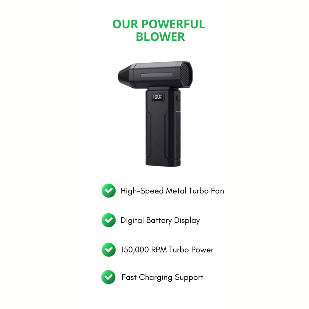 Blasts dust with 150,000 RPM velocity.